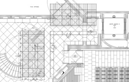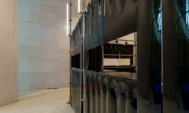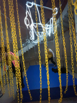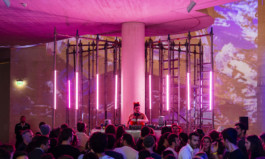 The podium has been integrated in the staircase, wrapped into a curtain of chains in yellow PVC that can host dancers during the event. The stage on the other hand is generated by a self standing column present in the space that becomes the pivot for a 360° dancefloor.